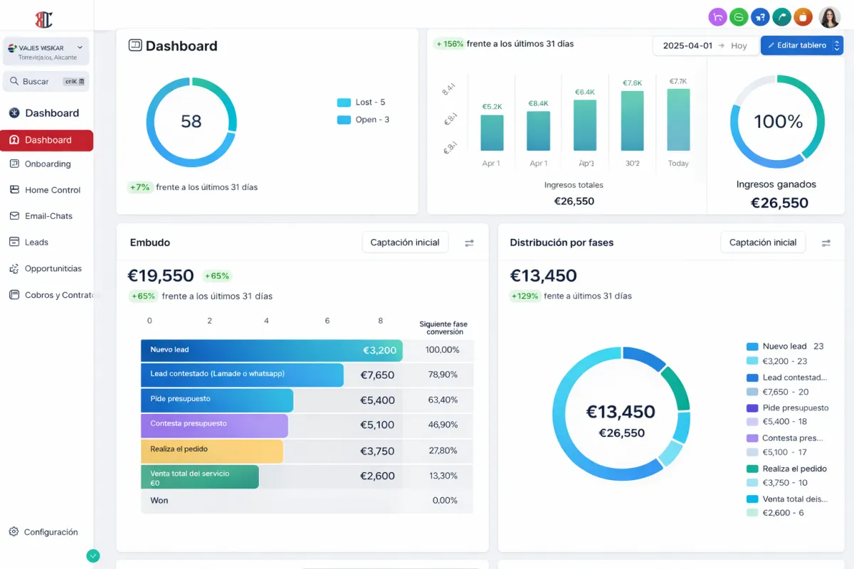 Control real de leads y clientes, etapas claras y trazabilidad.