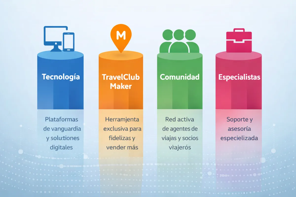 Tecnología con IA (NeuroHUB x12), TravelClubMaker x12 para crecer sin vivir comprando anuncios, formación semanal y una comunidad de empresarios que te arropa.