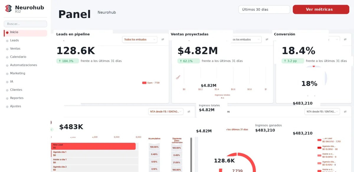 Centraliza operación y ventas: CRM, automatización, embudos, calendarios, páginas, comunicaciones y clones IA.